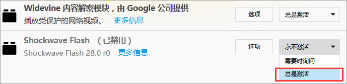 依次进入浏览器:菜单\附加组件\ShockWave Flash,设置为:总是激活